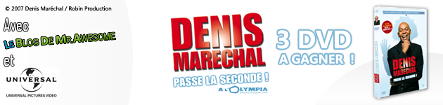 A l’occasion de la sortie en DVD le 3 novembre dernier du dernier spectacle de Denis Maréchal « Denis Maréchal passe la seconde« , nous vous proposons de jouer avec le Blog de Mr Awesome et Universal Vidéo pour tenter de remporter un des trois DVD de son spectacle mis en jeu.